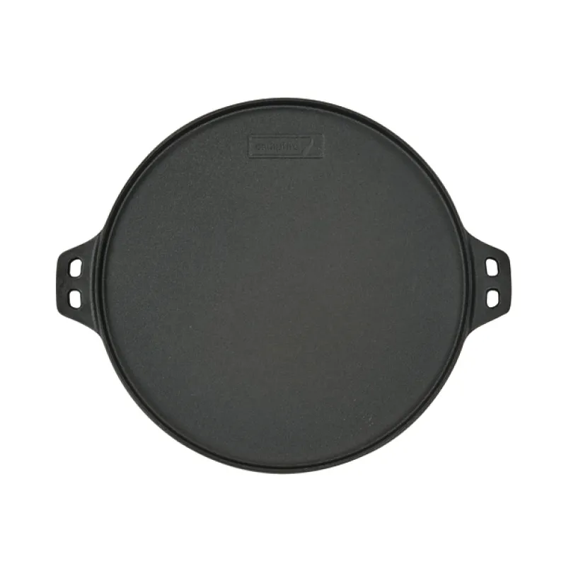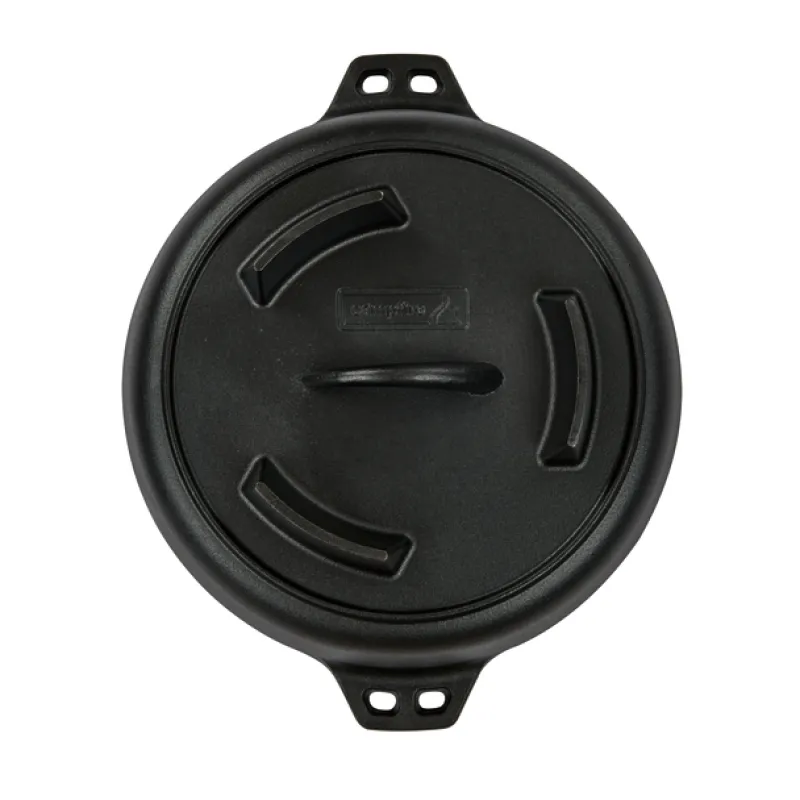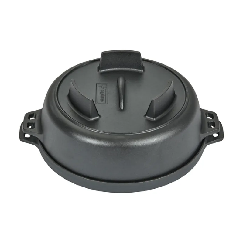 The 5-in-1 Camp Oven, made from heavy-duty cast iron, offers versatility with its ability to function as a grill, flat plate, wok, camp oven, or pizza oven. Pre-seasoned and ready for campfire cooking.