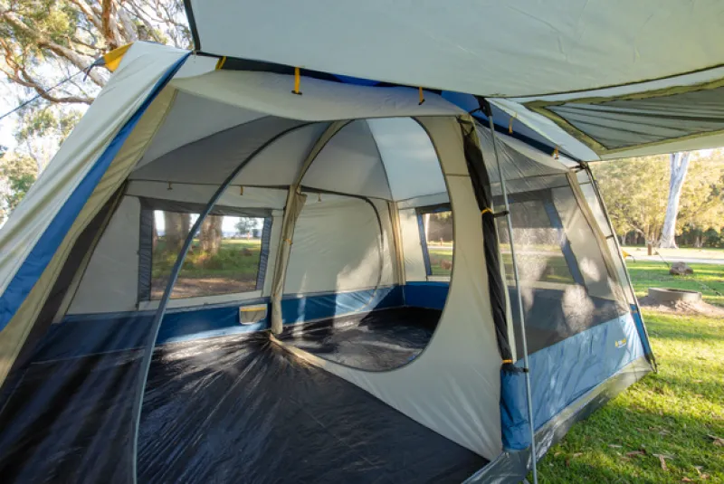 This spacious family tent features a portico pole system for extra internal space and a quick setup. With No-See-Um Mesh for airflow and insect protection, this tent is perfect for family camping trips. It has front and rear entries, a UVTex fly for superior sun and rain protection, and heavy-duty PE flooring for durability. Easily packed into a heavy-duty carry bag for storage and transport.