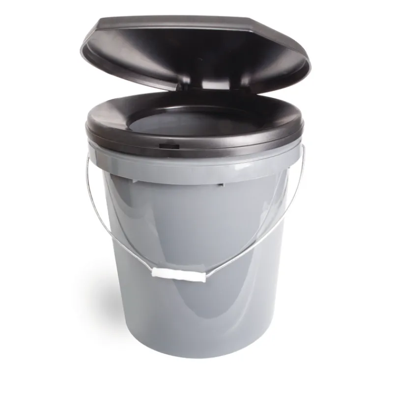 A portable and rugged bucket-style toilet, perfect for camping and outdoor adventures where access to toilets is limited. The snap-on hinged seat cover ensures cleanliness and comfort, while the convenient carry handle allows easy transportation. With a durable design, this toilet is built for outdoor use.