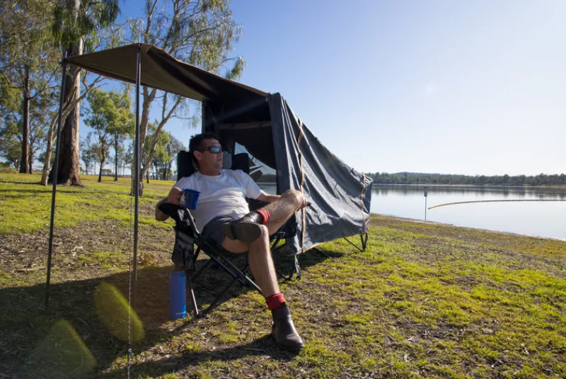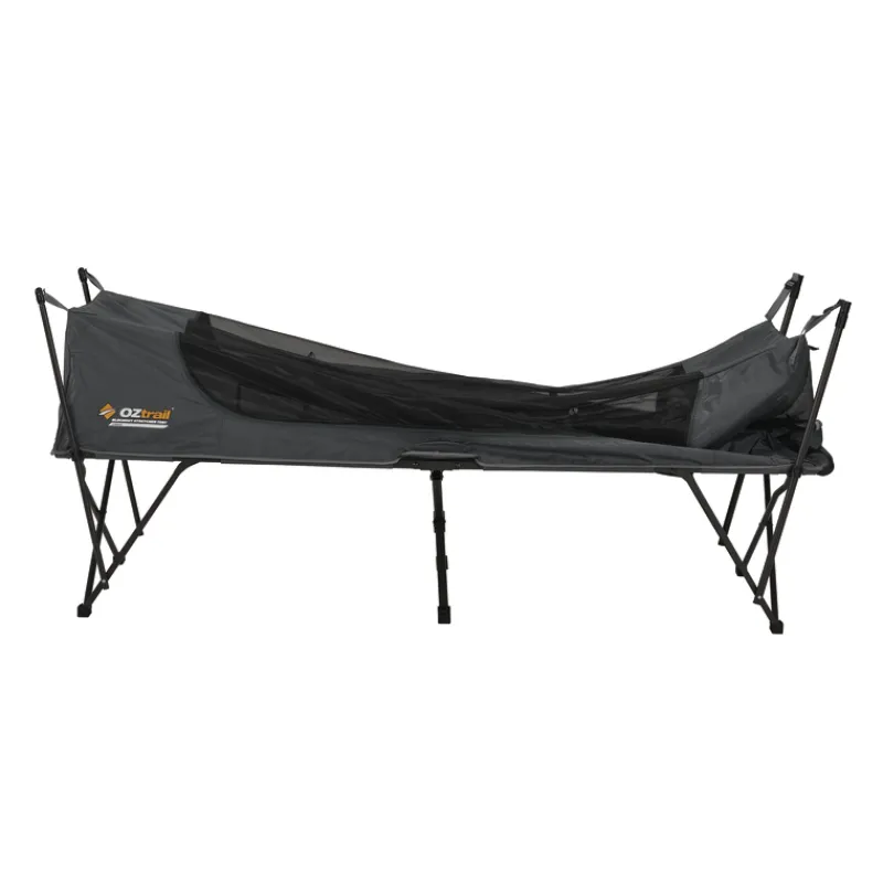 The Easy Fold Stretcher Tent features BlockOut® Technology to reduce light and heat, creating a more comfortable sleeping environment. It offers quick setup, durable construction, and multiple entry points for easy access.