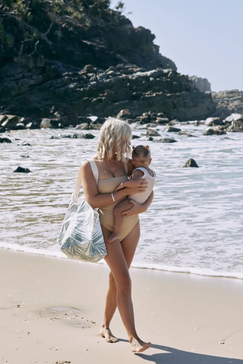 This oversized tote makes it easy to carry all your beach essentials. The cotton webbed straps provide comfort, while the base eyelets allow for quick removal of sand and water.