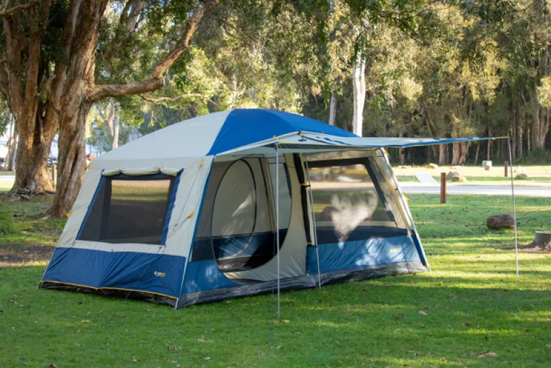 This spacious family tent features a portico pole system for extra internal space and a quick setup. With No-See-Um Mesh for airflow and insect protection, this tent is perfect for family camping trips. It has front and rear entries, a UVTex fly for superior sun and rain protection, and heavy-duty PE flooring for durability. Easily packed into a heavy-duty carry bag for storage and transport.