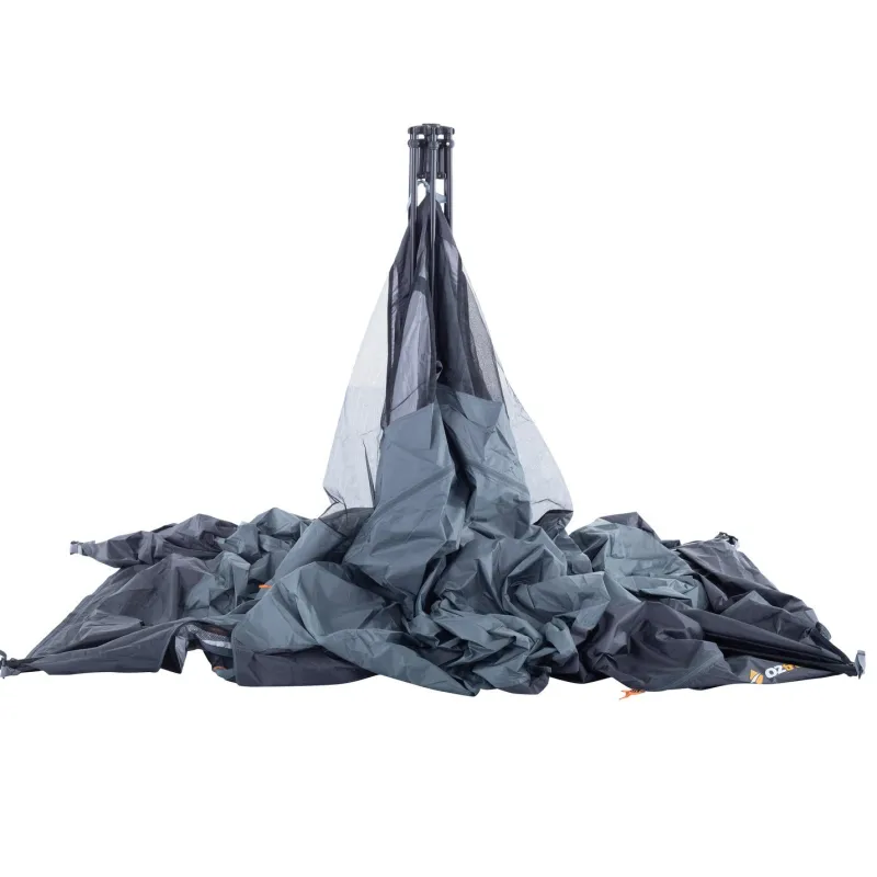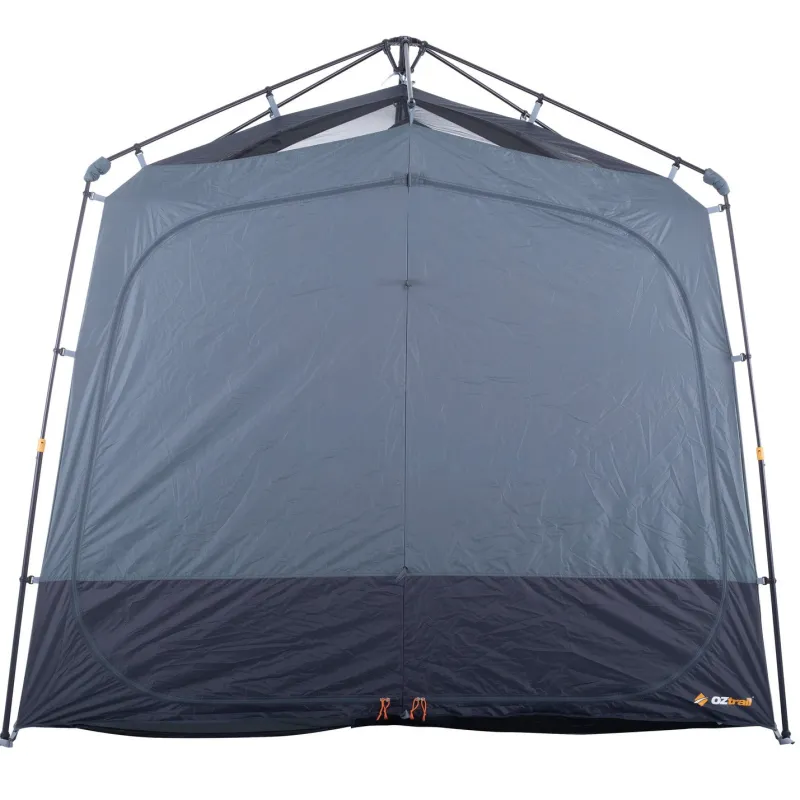 This 2-room ensuite tent features the Fast Frame design for quick setup, with one side for showers and the other for changing. Includes a clip-in floor, toiletry organiser, towel rack, and drain mesh.