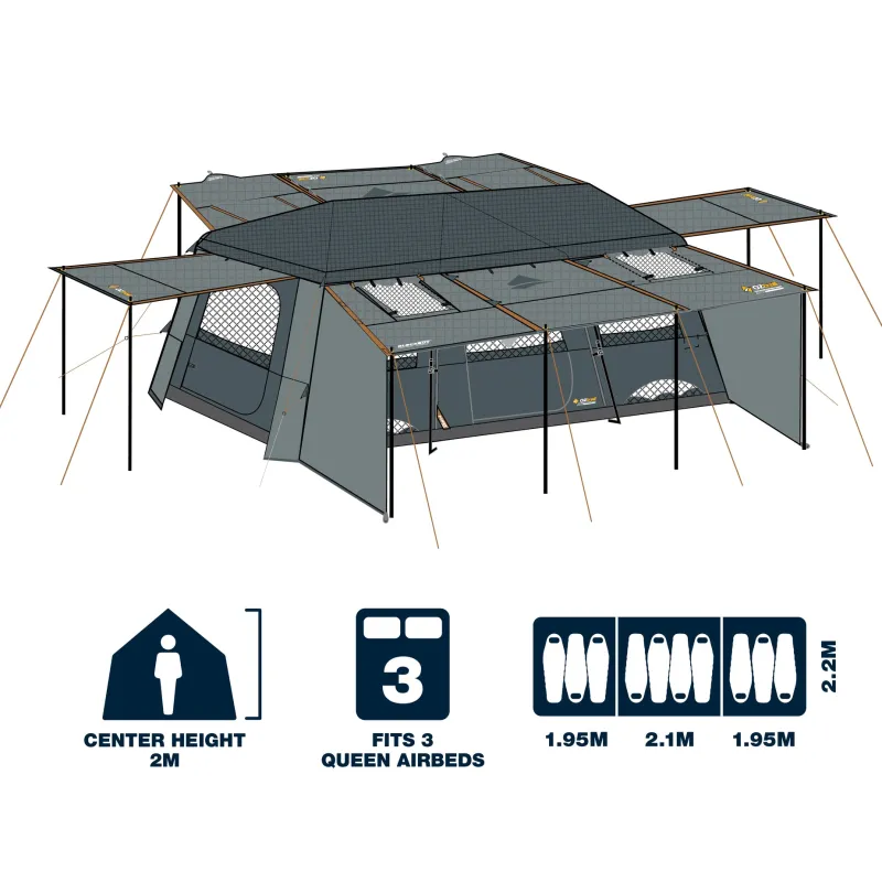- Spacious 3-room family tent with internal space and enhanced headroom for family camping.