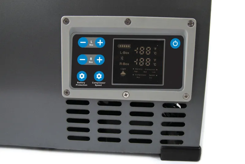 The 100L Dual Zone Fridge/Freezer is ideal for camping and recreation, offering a robust metal construction and dual speed LG compressor. It provides ample space and features a digital display control panel.