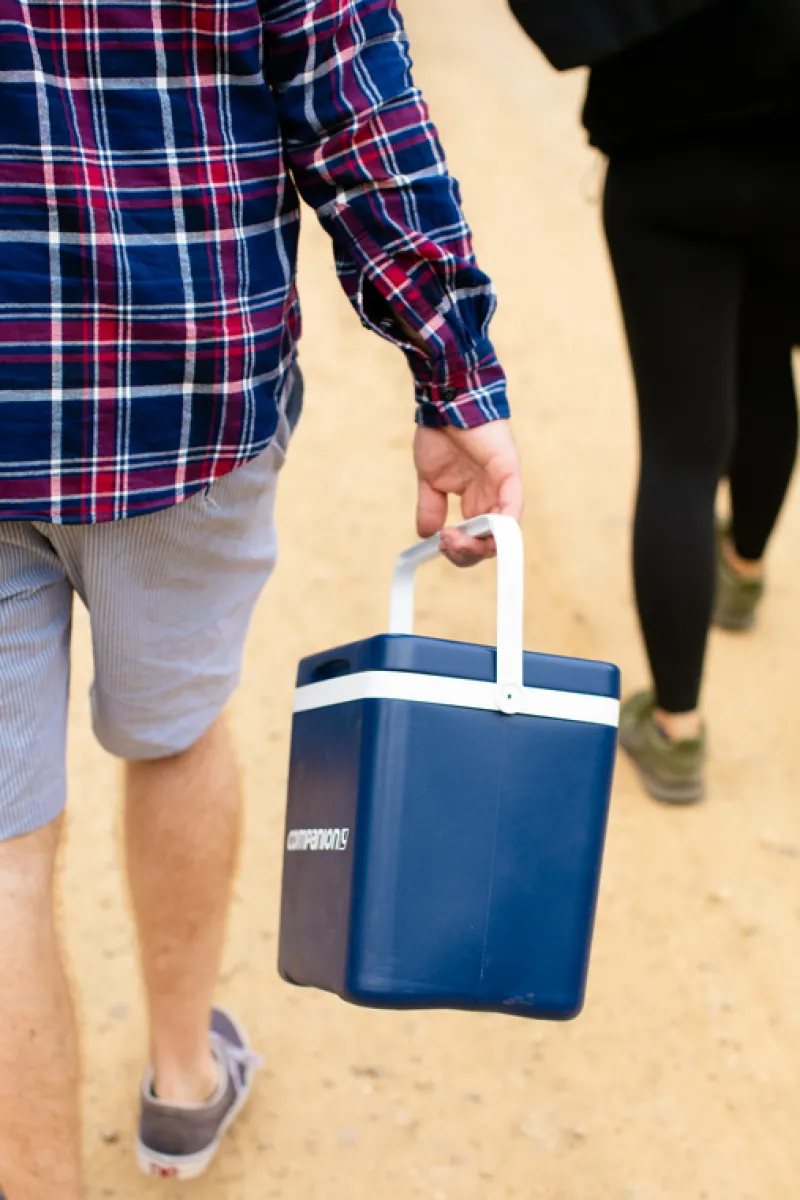 The 14L Blue Cooler is designed for convenience with integrated cup holders and a snap-in ice brick feature to keep your contents cool.