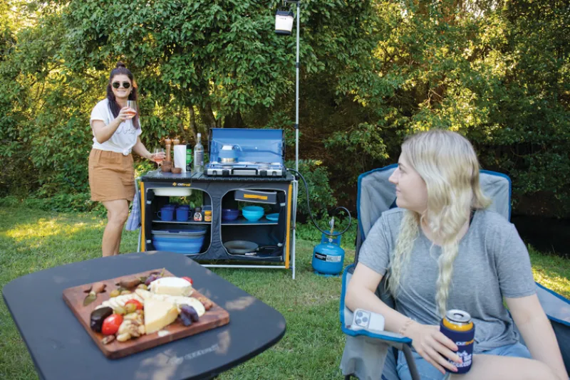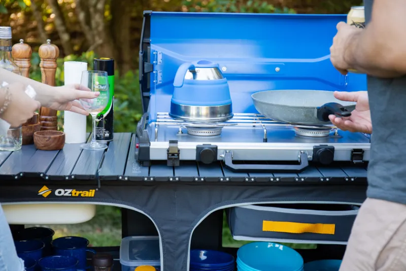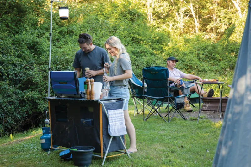 An all-in-one portable camp kitchen with an integrated sink, double cupboard, and a quick setup steel frame. The unit includes a lantern pole, towel rail, and mesh pockets for added storage, making it ideal for camping.