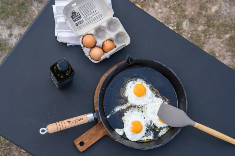 30cm round frypan with a removable wooden handle for easy storage. Pre-seasoned and ready to use for versatile cooking.