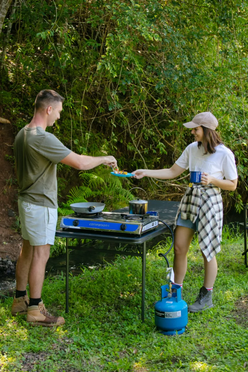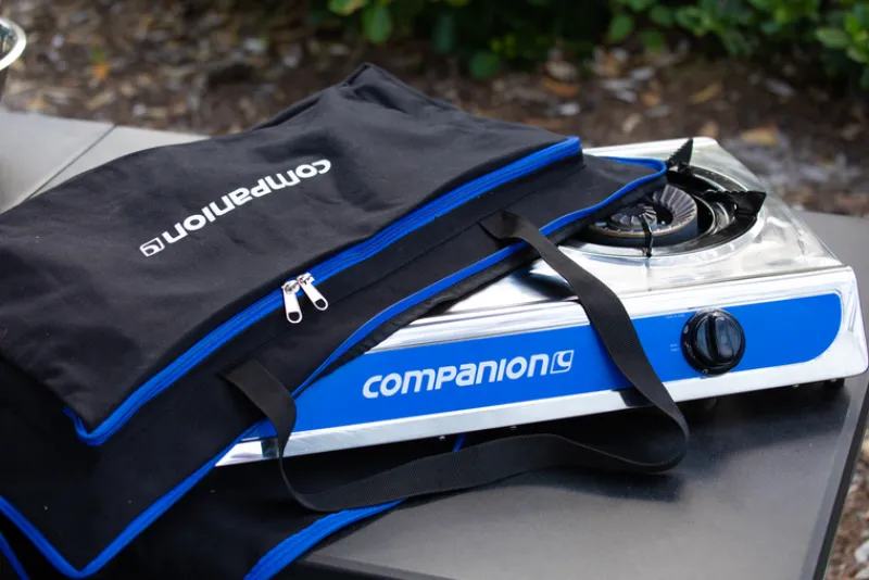 The double burner wok cooker delivers powerful heat output and is ideal for cooking with large pots. Includes piezo ignition and a 1200mm gas hose (carry bag not included).