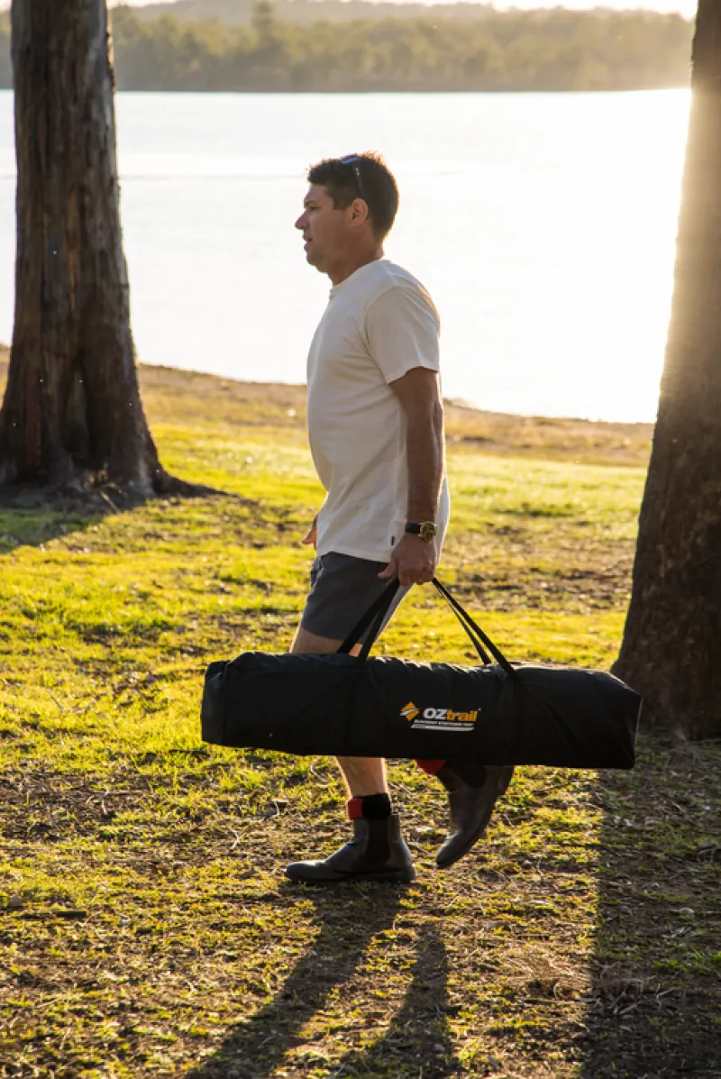 The Easy Fold Stretcher Tent features BlockOut® Technology to reduce light and heat, creating a more comfortable sleeping environment. It offers quick setup, durable construction, and multiple entry points for easy access.